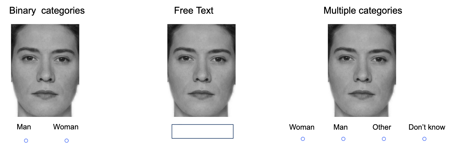 The experiment used a between-participants design. There were three conditions with different response options: binary categories, free text, and multiple categories (see Figure 4). In the binary categories condition, the response options consisted of two categories: woman and man. In the free text condition, the response options consisted of an open text box. In the multiple categories condition, the response options consisted of four categories: woman, man, other, and I don’t know.
