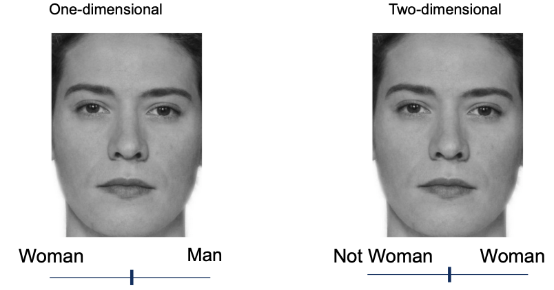 Participants completed the experiment on a computer in a quiet room. Each trial consisted of a face accompanied by the question, “How would you gender categorize this person?”. In the one-dimensional condition, participants rated gender based on a single continuum, with the anchors marked woman and man. In the two-dimensional condition, participants rated each face once on a woman continuum (the anchors were marked not woman and woman) and once on a man continuum (anchors were marked not man and man). The separate continua were presented on different trials, and the order of trials was completely randomized in both conditions (see Figure 2).