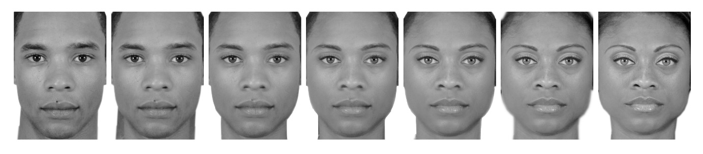 The experiment included Black, Asian, and White faces from the London Face Database (DeBruine & Jones, 2017) and the Chicago Face Database(Ma et al., 2015) morphed with Webmorph (DeBruine, 2018). We selected matched pairs of faces of women and men, ensuring that the women were rated at similar levels of feminine as the men were rated masculine . The morphs were made in 7 steps, from completely feminine to completely masculine. We defined facial gender as the degree of the female face present in the morph. In other words, a 33% face was slightly masculine, a 50% face was an even mixture of the two faces, and a 100% face consisted only of the woman’s face. Because there were 18 face pairs morphed in 7 steps, the total number of faces was 126.